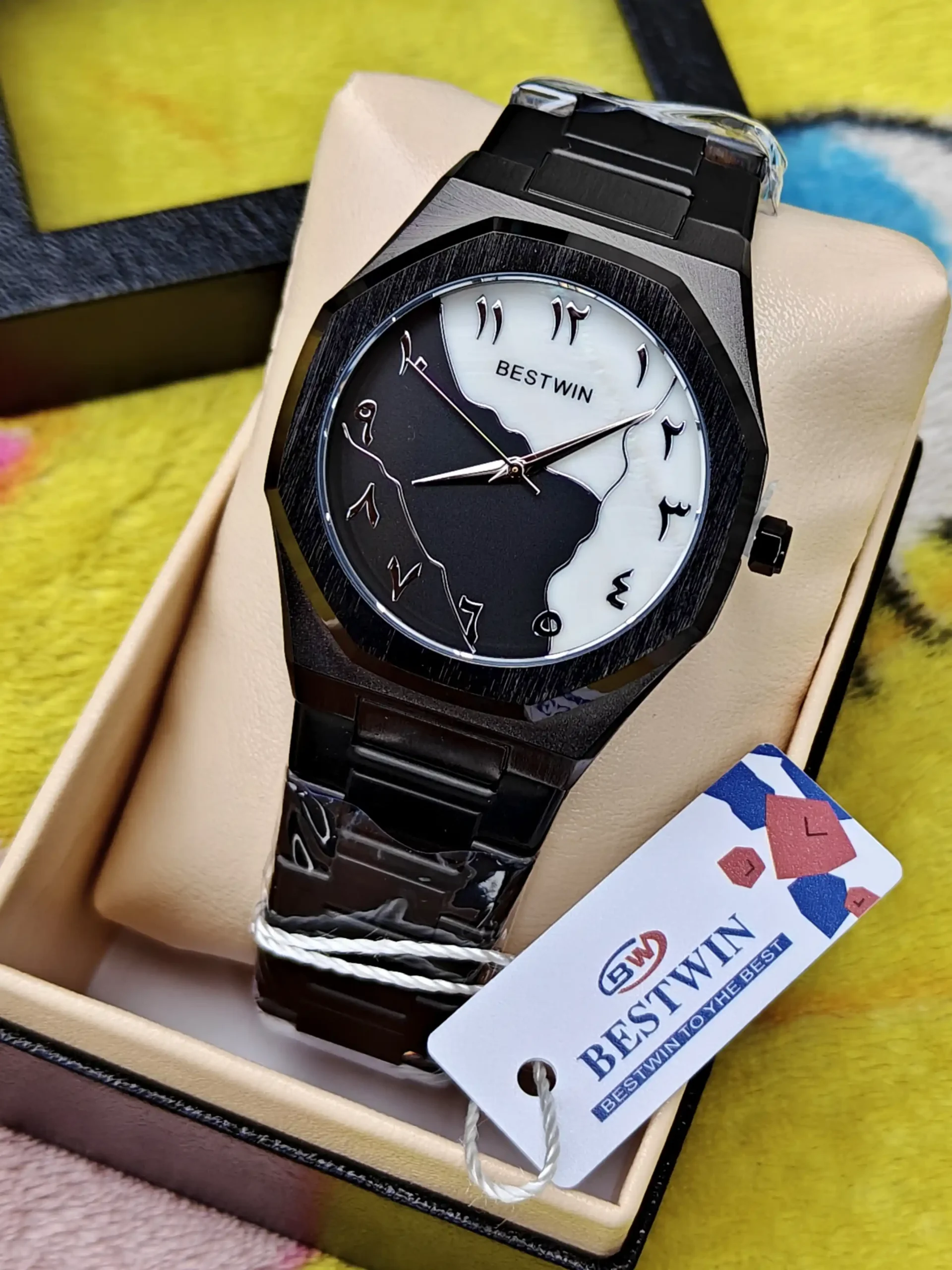 The Bestwin wristwatch features a unique black and white split dial design with Arabic numerals, offering a blend of tradition and modern aesthetics. With a durable stainless steel strap and precision quartz movement, this watch is both stylish and reliable.