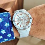 The AR1424 watch model is made of the highest quality materials, thanks to which it gives it functionality. The white bracelet together with the white dial look amazing on the wrist, attracting attention. The water resistance of this watch is 5ATM, making it splashproof.
